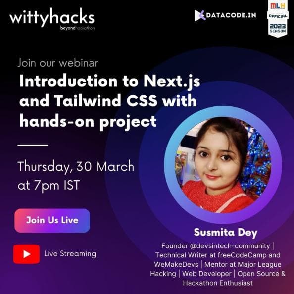 Ignite your web development journey with Next.js and Tailwind CSS! Join Susmita Dey in this hands-on project-based event where you'll unravel the magic of building modern, responsive websites. Don't miss out on this transformative learning experience!
